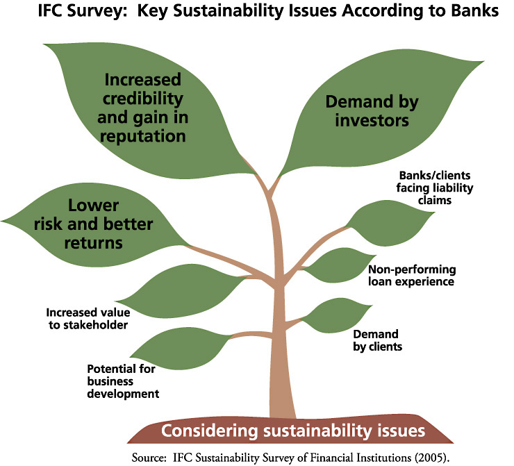 According to IFC’s 2007 report Banking on Sustainability, which included a survey of 120 financial institutions in 43 emerging markets, the integration of sustainability into management systems and practices brings tangible benefits, including new lines of business, new clients, greater access to financing, greater shareholder value, and improved reputation and goodwill. Seventy-four percent of the commercial banks in the survey reported a reduction in risk as a result of considering environmental and social issues. Another 48 percent noted improved access to international capital, 39 percent benefited from improved brand value and reputation, 35 percent developed new business, and 26 percent benefited from improved community relations.
