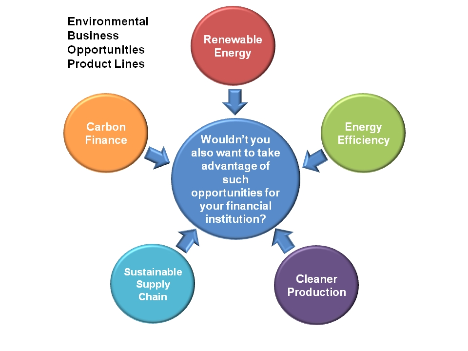 The products that FIs offer to the market when pursuing Environmental Business Opportunities are no different than traditional financial products. The difference is in how the products are marketed and how the lendees/ investees are incentivized.